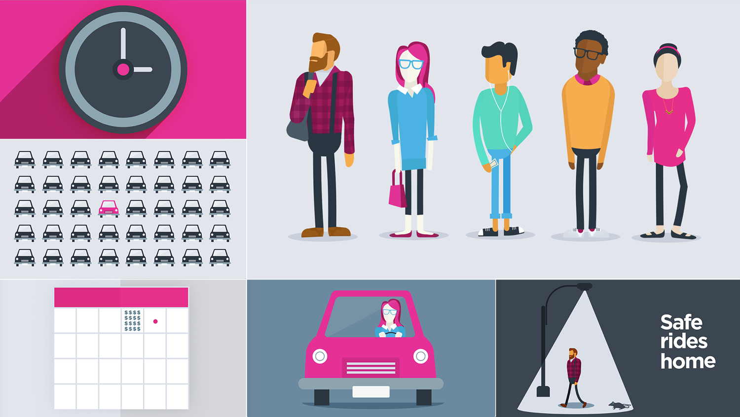 This was an explainer of Lyft's enterprise program. In hindsight, the style probably didn't make the most sense for a business program, but it was a ridiculously short timeline (4 or 5 weeks) without a brief or background and no existing brand or identity work on the new program, so I didn't really get to think too hard. Ah, start-up life.